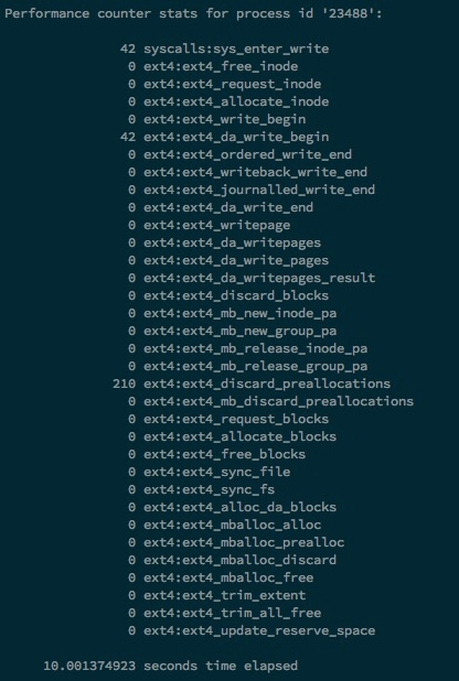 sudo perf stat -e "syscalls:sys_enter_write,ext4:*" -p 23488 sleep 10
